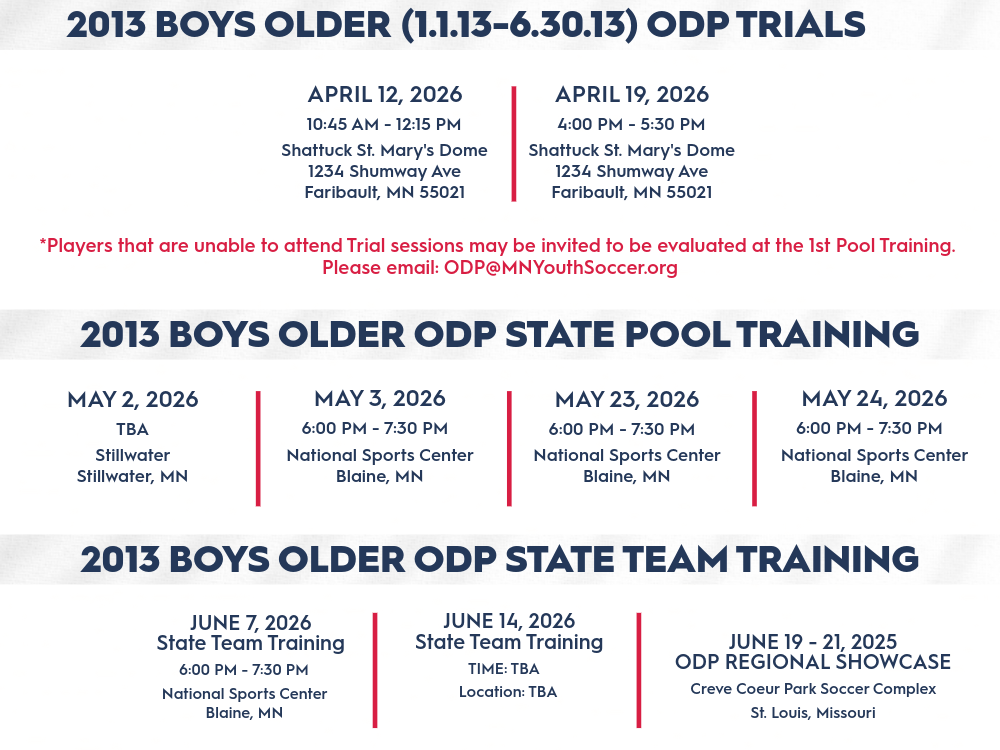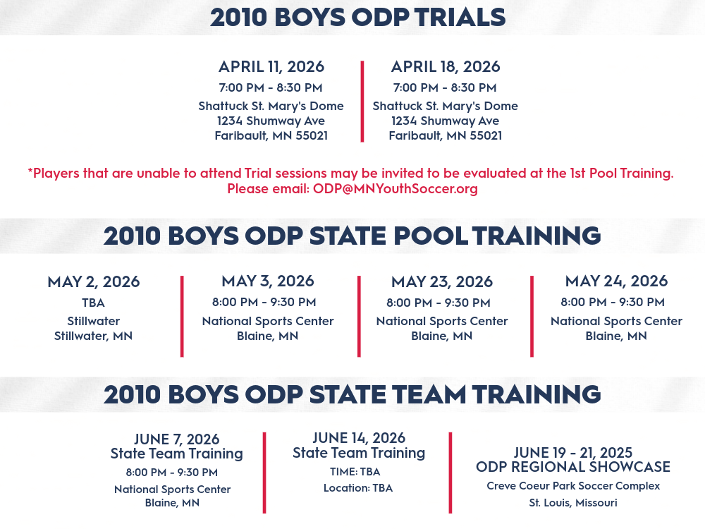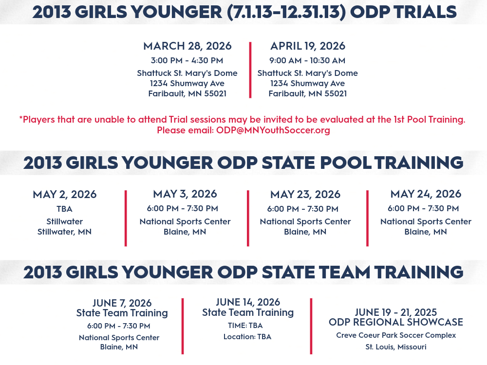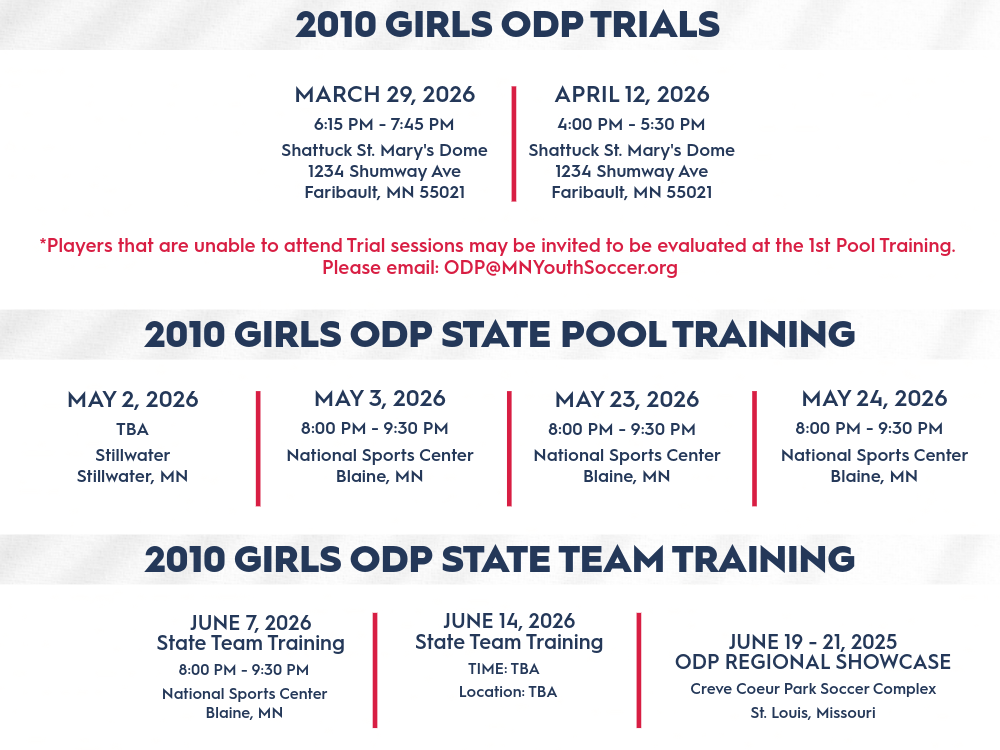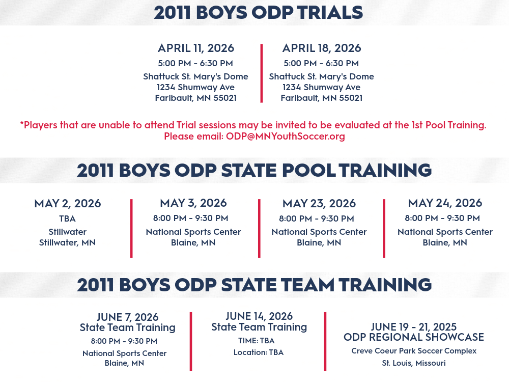 Trials take place over the course of two sessions that are approximately 75-90 minutes each. Players are encouraged to attend both Trial sessions, but if there is a scheduling conflict please email ODP@MNYouthSoccer.org and include Players Name, Gender, Birth Year, Date of Trial Session that will be missed, Conflict (club team event or other). This helps us ensure the player is evaluated at the Trial session that they will be attending.