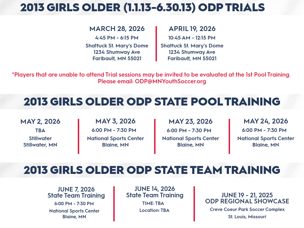 Following both MN ODP Trial dates, the coaching staff may invite players that weren’t able to attend Trials to the first MN ODP State Pool session to be evaluated. It is not guaranteed that players will be invited to the first Pool Session. Players are highly encouraged one of the two Trial sessions if possible, rather than not attending at all.